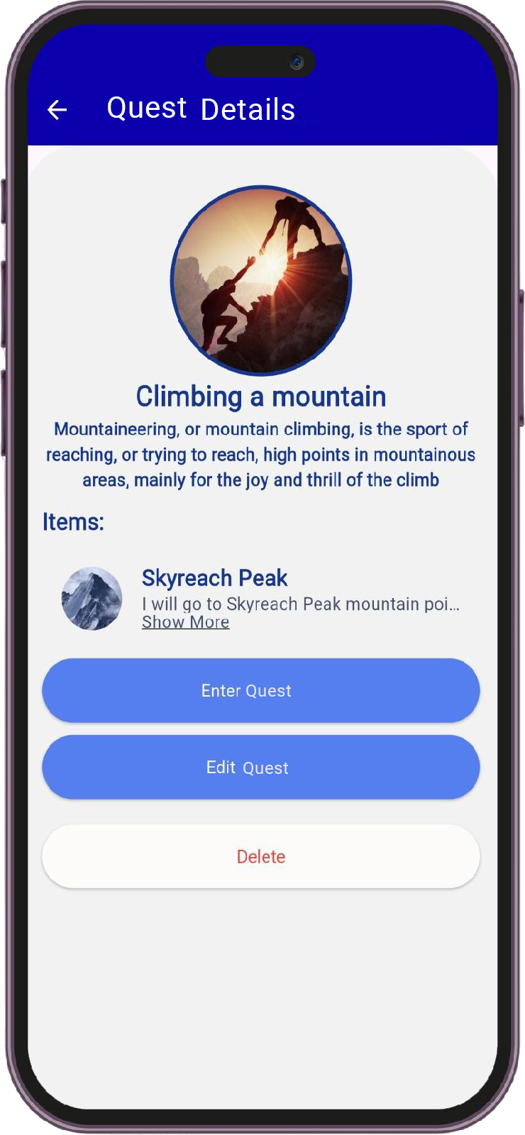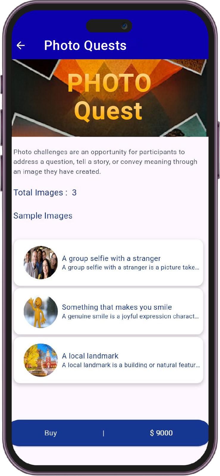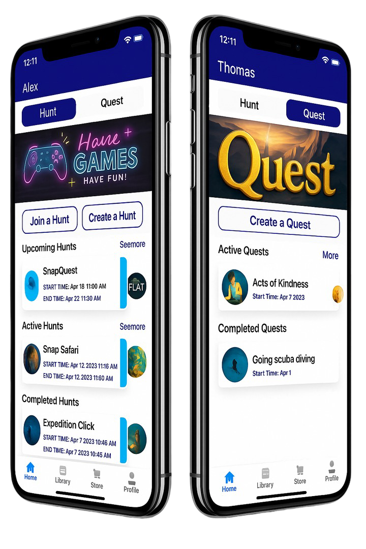 A Quest is a solo adventure where an individual player searches for items at their own pace. Quests do not require host approval for items, and the quest creator has full control over when the experience ends. This allows quests to remain personal, flexible, and tailored to the individual’s journey, with each participant receiving their own recap video.